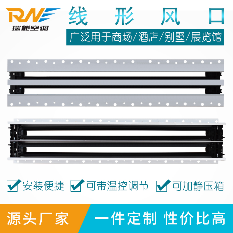 3、固定条形风口,固定条形风口用在供热及供冷的空调系统中,可安装在侧墙上或天花板上。